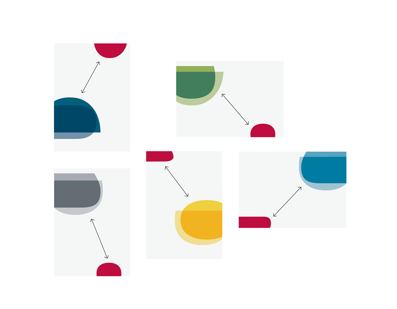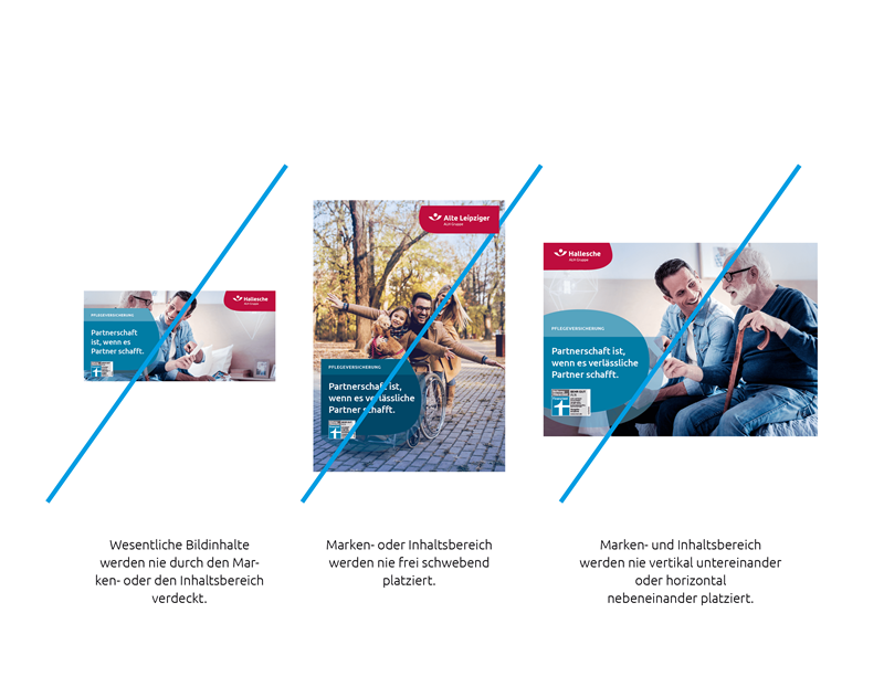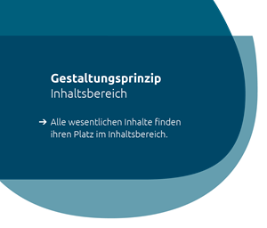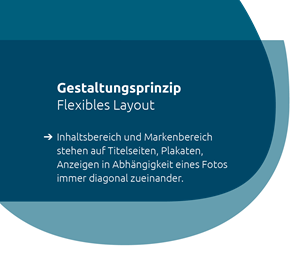 Das Gestaltungsprinzip bietet ein Höchstmaß an Flexibilität, indem sich Inhalte variabel arrangieren lassen. Der Inhaltsbereich wird unter Berücksichtigung des Bildelementes flexibel im Layout eingesetzt. Der Markenbereich steht immer diagonal zum Inhaltsbereich am oberen oder unteren (auch seitlichen) Formatrand. Die diagonale Anordnung der Elemente sorgt für Abwechslung, Dynamik und Lebendigkeit im Layout.