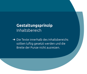 Der Inhaltsbereich setzt sich aus zwei überlagerten Punzen zusammen. Durch die Überlagerung entstehen Räume, die der Sortierung der Inhalte dienen. Die obere Überlappung bietet Raum für das Produktleitsystem. In der zentralen Schnittmenge wird die Headline platziert. Die Headline sollte kurz sein, einen Bildbezug herstellen und wenn es passt mit einem kleinen Augenzwinkern geschrieben werden. Die untere Überlappung kann optional für untergeordnete Informationen genutzt werden. Grundsätzlich gilt, die einzelnen Ebenen textlich nicht zu überfrachten.