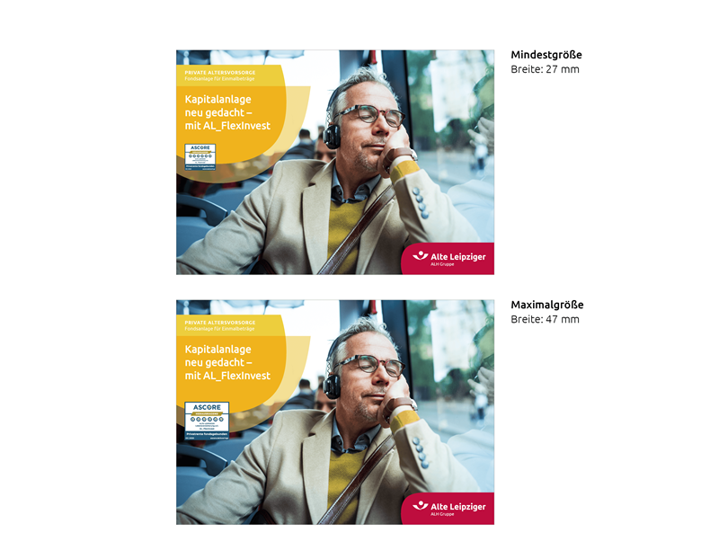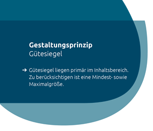 Bei der Platzierung von Gütesiegeln ist eine Mindestbreite von 27 mm (z. B. bei der Gestaltung kleiner Formate) sowie eine Maximalbreite von 47 mm (z. B. bei der Gestaltung von Broschürentiteln oder ganzseitigen Anzeigen) zu berücksichtigen. Die Mindestgröße der Schrift im Siegel beträgt 6 pt. Das Qualitätssiegel wird innerhalb des Inhaltsbereichs platziert und darf dabei aus der Schnittmenge ragen. Die Siegel stehen jeweils unterhalb der Headline.