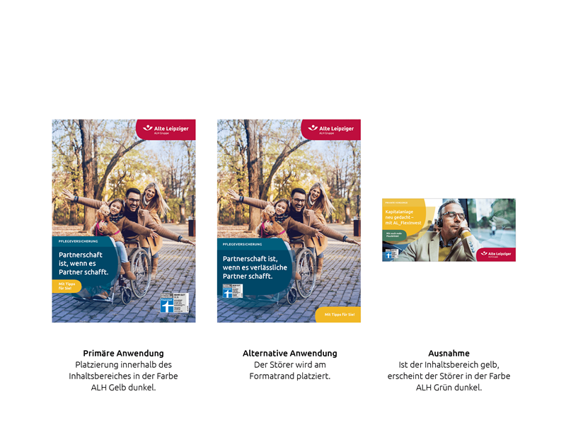 Störer fügen sich als aufmerksamkeitsweckende Elemente unaufdringlich und doch effektiv und kontrastreich (ALH Gelb dunkel) in das Layout ein. Ist der Inhaltsbereich gelb angelegt, so nimmt der Störer die Sekundärfarbe ALH Grün dunkel an. In der Regel wird der Störer dem Inhaltsbereich zugeordnet (analog der Gütesiegel). Alternativ werden Störer am Formatrand platziert.