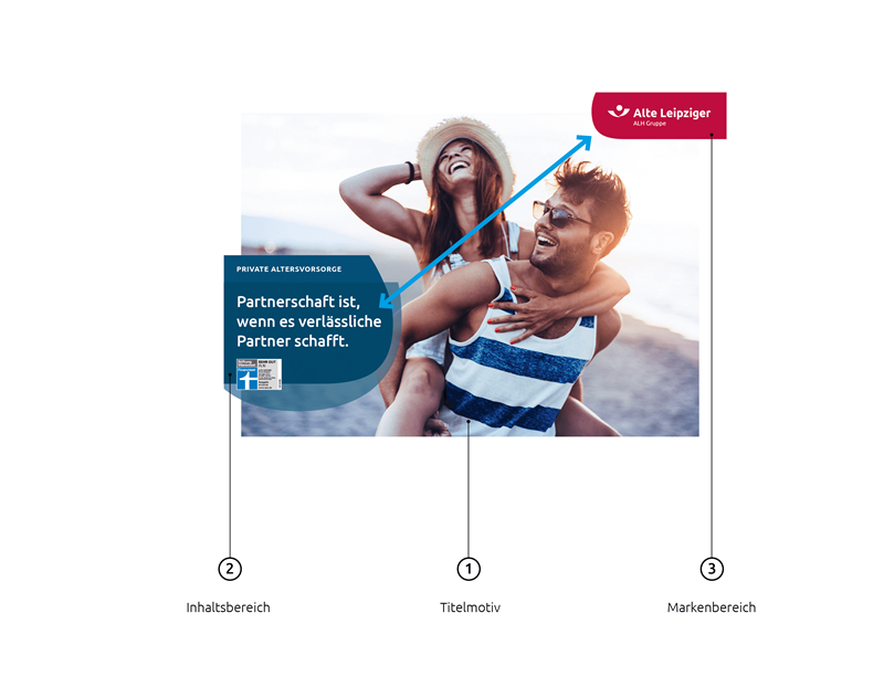 Um ein stimmiges Layout zu gestalten, in dem die Gestaltungselemente optimal positioniert sind, empfiehlt sich eine bestimmte Vorgehensweise. Ausgehend vom ausgewählten Bild (1) wird der Inhaltsbereich (2) an geeigneter Stelle positioniert, sodass die wesentlichen Bildinhalte nicht verdeckt werden. Hieraus ergibt sich die diagonale Positionierung des Markenbereichs (3).