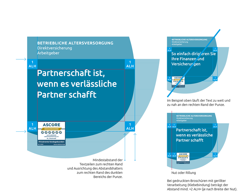 Für einen optisch ansprechenden Zeilenfall sind folgende Maßgaben zu berücksichtigen. Innerhalb des dunklen Bereichs (Schnittmenge) kommen die Abstandshalter zum Einsatz. Der Abstandshalter »1 ALH« im Format A4 beträgt 8 x 8 mm und wird am linken und oberen Rand, sowie an der rechten Außenkante der Schnittmenge angesetzt. Unten wird der Abstandshalter am Übergang von der Schnittmenge zur überlappenden Fläche angesetzt. Die rote Markierung zeigt den zur Verfügung stehenden Bereich für Text.