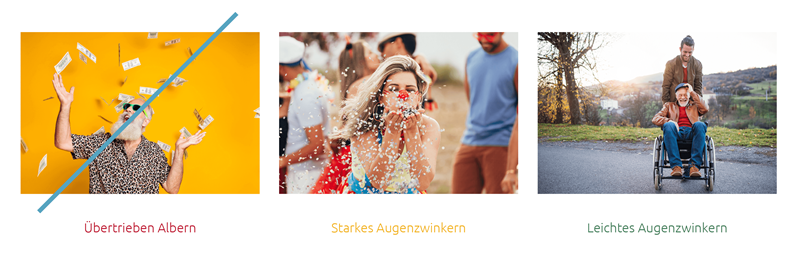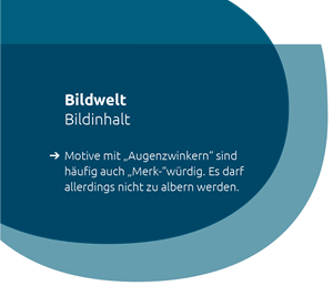 Die Bildwelt soll Spaß machen. Humor ist stets ein gutes Mittel, um die Aufmerksamkeit auf sich zu ziehen. Ein Augenzwinkern sollte aber genügen, so dass es nicht zu albern wird, denn immerhin geht es um ernste und seriöse Themen.