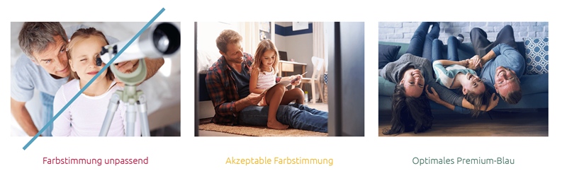 Die Tonalität besticht durch ihre edle Note in Premium-Blau. Wenn ein Motiv allen geforderten Anforderungen entspricht, aber die Farbstimmung eine andere ist, so lassen sich die Motive mit wenigen Handgriffen farblich anpassen (siehe: Bildbearbeitung).
