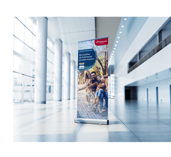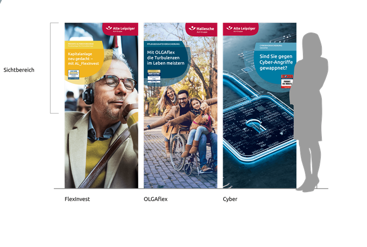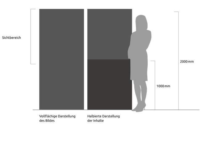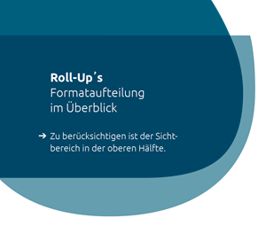 Motive werden auf dem Roll-Up vollflächig dargestellt. Um die zu spielenden Inhalte in einem sichtbaren Bereich darzustellen, ist es von Vorteil zu wissen, wo das Roll-Up aufgestellt wird. Es kann passieren, dass der untere Bereich durch Tische, Stühle oder Podeste verdeckt wird. Umso wichtiger ist es, den gesamten inhaltlichen Kontext in der oberen Hälfte zu platzieren.
