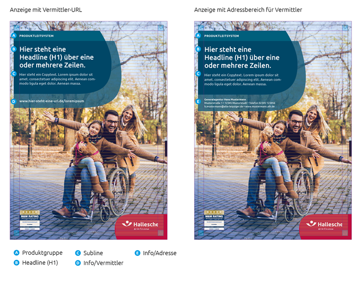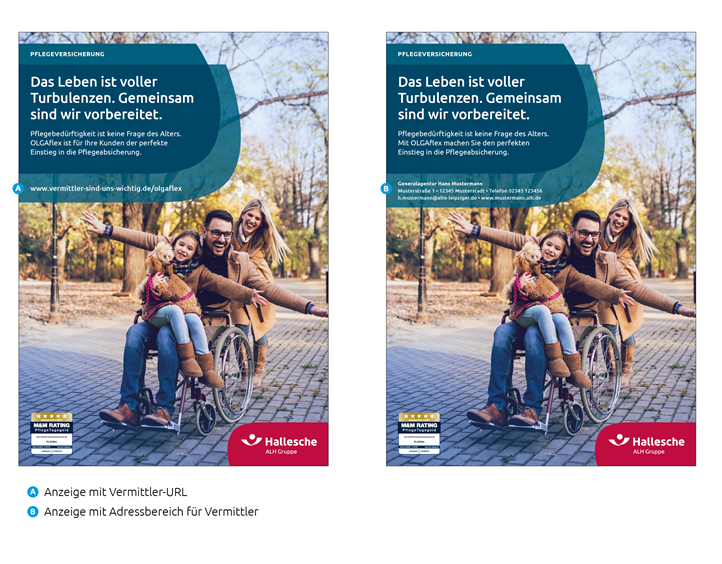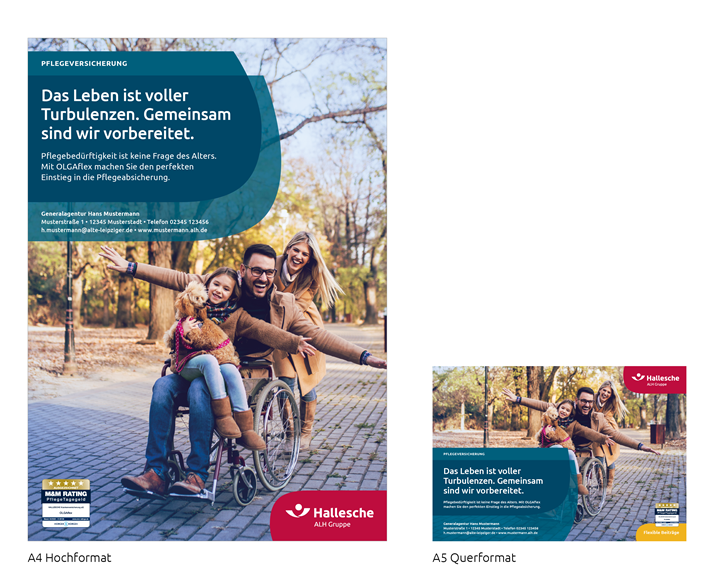 Die Anzeigen der ALH Gruppe werden in unterschiedlichsten Größen, sowohl im Hoch- als auch im Querformat umgesetzt. Die Anzeigen sind so konzipiert, dass sie als klassisches Printprodukt zur Verfügung gestellt oder aber auch als digitale Form am Bildschirm gut gelesen werden können. Das Konzept berücksichtigt verschiedene Formate. Diese zeigen anschaulich, wie konkrete inhaltliche Anforderungen im Sinne des Corporate Designs der ALH Gruppe umgesetzt werden können.