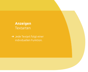 Für die Broschürenlayouts sind verschiedene Textarten definiert, um die Inhalte optimal abbilden zu können. Jeder Textart ist eine individuelle Funktion zugeordnet. Im Gegensatz zu den Broschürentiteln ist bei den Anzeigen ein informativer Copytext in Form von Sublines erlaubt.