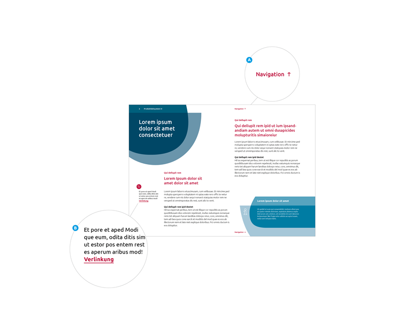 Der PDF-First-Ansatz im digitalen Kontext bietet die Möglichkeit, das PDF interaktiv zur Verfügung zu stellen, um eine höhere Nutzerfreundlichkeit zu erreichen. Diese Interaktion bezieht sich auf die Navigation (A), die es dem Leser ermöglicht, sich per Klick durch das PDF zu navigieren. Weiter können Verlinkungen (B) innerhalb der Marginalie oder dem Fließtext gesetzt werden, um beispielsweise direkt auf das Produktangebot auf der Corporate-Website zu verlinken und dem Leser einen schnellen Zugang zu weiterführenden Angeboten und Services zu ermöglichen.
