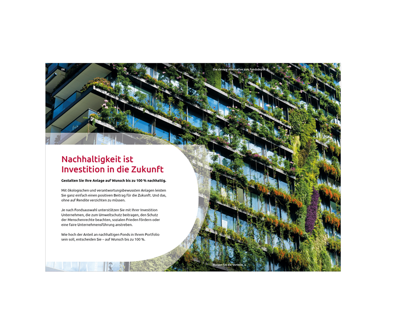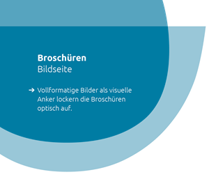Um Broschüren optisch aufzulockern, können zwischen informationslastigen Textseiten Bildseiten eingestreut werden. Ergänzende Copytexte werden in Kombination mit einer aussagekräftigen Headlines auf einer Content-Punze im Sinne des Gestaltungsprinzips auf dem Bild platziert, ohne wesentliche Bildinhalte zu verdecken.