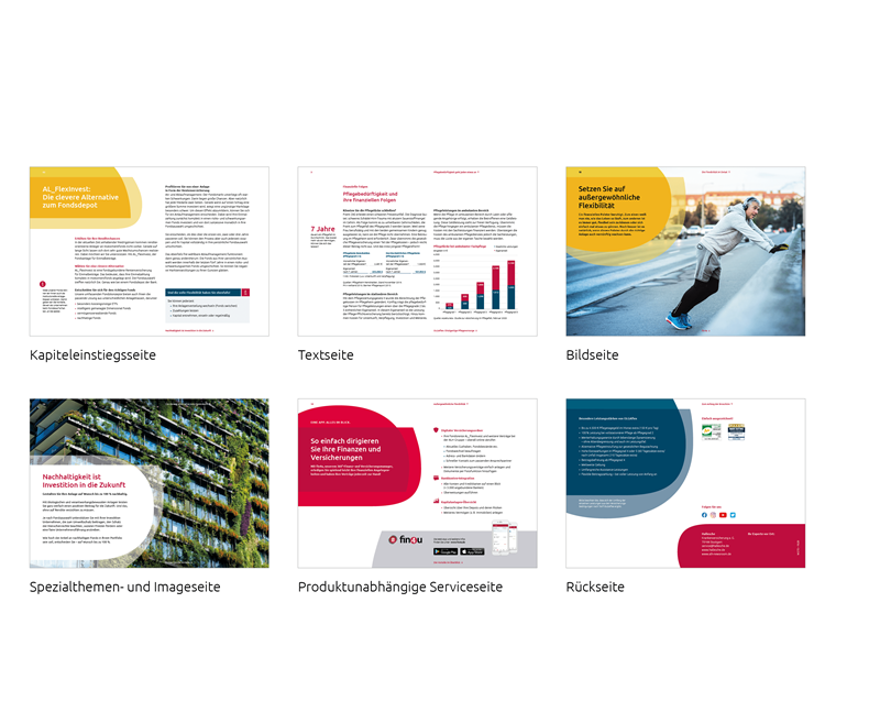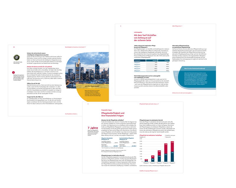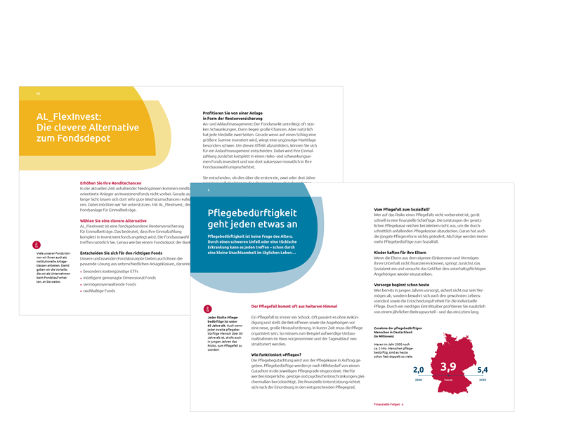 Textseiten bündeln die wesentlichen Informationen und Inhalte der jeweiligen Broschüre. In Kombination mit emotionalen Bildern, informativen Grafiken und Tabellen, erzählerischen Icons und Schnellleser-Informationen in der Marginalspalte werden die Leser facettenreich und auf lebendige Art und Weise informiert.