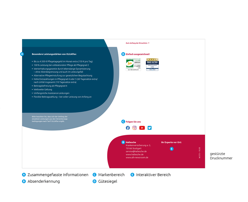 Die Rückseiten der Broschüren erfolgen einem gleichbleibenden Aufbau: Zusammengefasste Informationen der jeweiligen Broschüre werden oben links durch die Platzierung auf einer Content-Punze hervorgehoben, diagonal dazu erfolgt die Platzierung der Absenderkennung in Form eines Markenbereichs mit den dazugestellten Social-Media-Icons. Gütesiegel erhalten einen repräsentativen Stellenwert oben rechts im Layout. Vorlagen zur Rückseite sind in den Broschüren-Templates hinterlegt. Mit Hilfe des interaktiven Bereichs kann der Anwender/Vermittler in dem PDF durch vordefinierte Zeilen seine Adresse selbst eintragen und somit die Broschüre personalisieren.